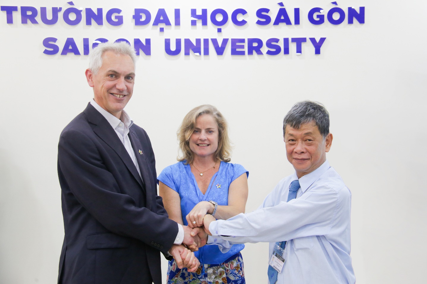 Assoc. Prof. Dr. Phạm Hoàng Quân, Professor Brian Stout, and Ms. Rebecca Ball shaking hands to demonstrate the close cooperation between the universities of Australia and Vietnam.